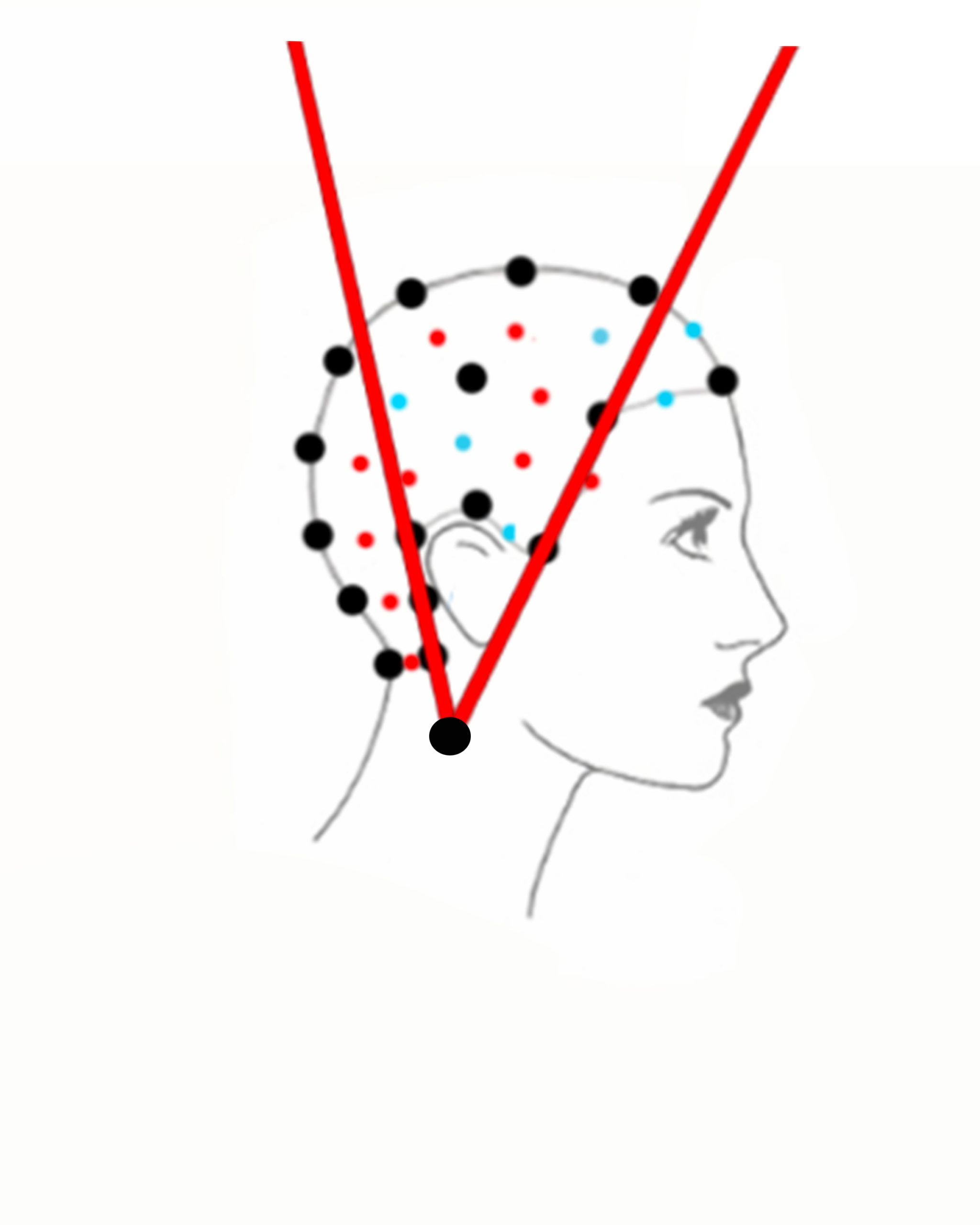 この点は、ネープ部の中心点としてはあまり用いない点ですが、私の「Less Distorted Hair Designing」手法において重要な主要回転点の一つです。この手法では逆円錐形が特徴です。この回転点により、耳の後ろのポイントと頸部の角との間でヘアラインを滑らかに接続することができます。このヘアデザイン手法は、下から上に向かって支持力のベクトルを作成することを目的としているため、この頸部中心回転点は不可欠です。