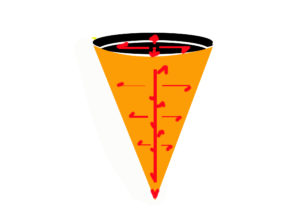 円錐は切り口が丸い三角形という特徴を持った形なので、その両方の力線の特徴を持っています。筆というのはその形が逆さになった状態で使用される道具なのです。物質の質量としては上に行くほど密度が高く、重量も重い。しかしながら、三角形の頂点に向かう力線が下方向の頂点へ向けてそのエネルギーを伝えています。その間ずっと、丸い断面のどの部分もが円形に見られる中心から外へ向かう膨張型の力線を内包しているため、その二つの力線を合わせると、まるでそれは螺旋にエネルギーを下に伝える竜巻のような力線に変化します。竜巻は地上に近い所ほど薪が細くなり、最大の破壊力を持ちます。